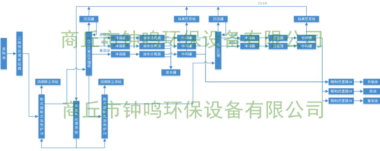 本生產(chǎn)裝置是利用塑料油生產(chǎn)柴油及副產(chǎn)品生產(chǎn)線,裝置主要配置;預(yù)處理反應(yīng)罐、臥式旋轉(zhuǎn)加熱爐1# 2# 2臺套,常壓分餾塔、減壓分餾塔、列管式冷凝器、冷卻水槽、油水分離器,過濾器,精制過濾罐,預(yù)處理系統(tǒng),加熱系統(tǒng),蒸餾系統(tǒng),冷凝系統(tǒng),真空負壓及廢氣回收處理利用系統(tǒng),消煙除塵系統(tǒng)、安全消防防爆靜電接地系統(tǒng),水處理循環(huán)利用系統(tǒng)、自控半自動控制系統(tǒng)等組成。